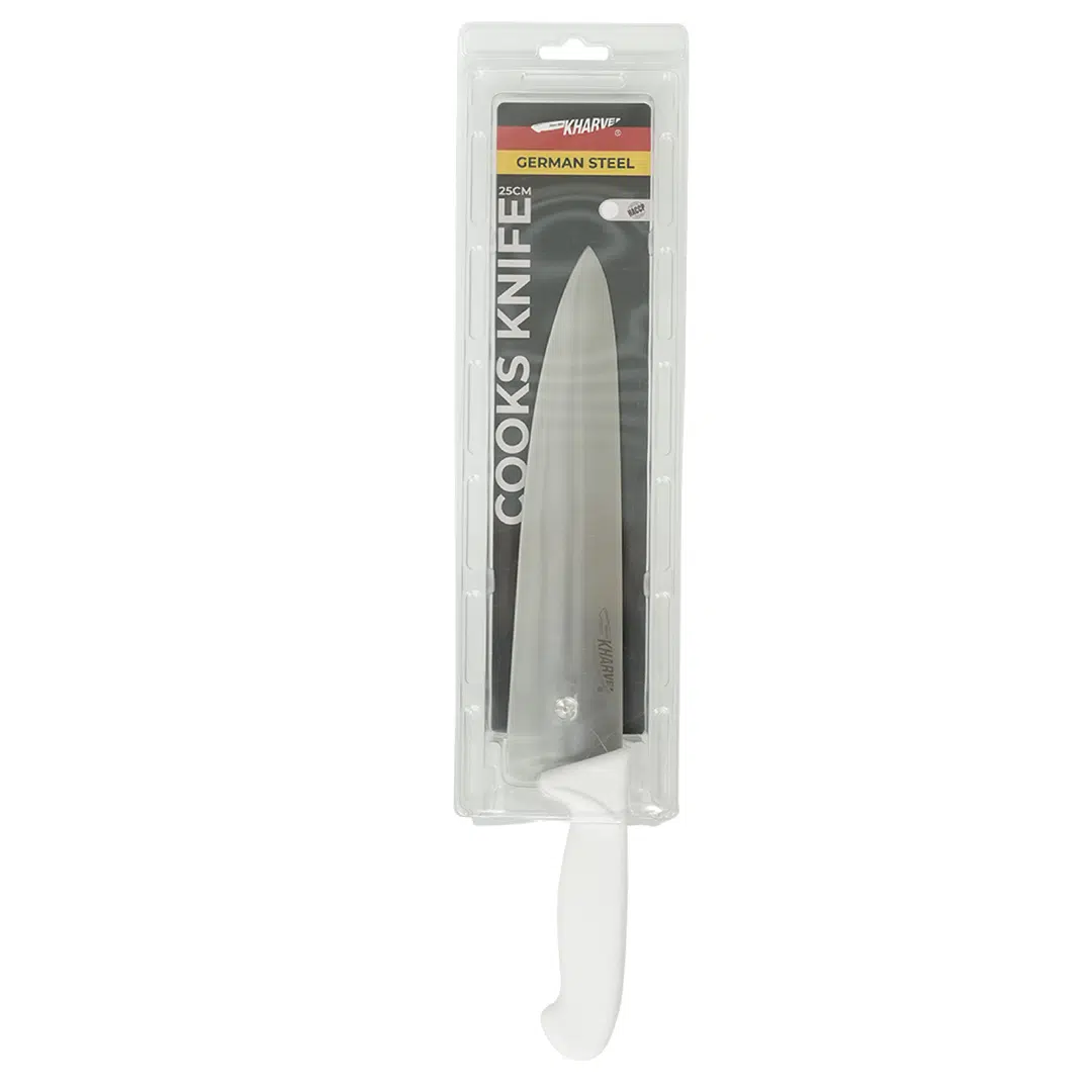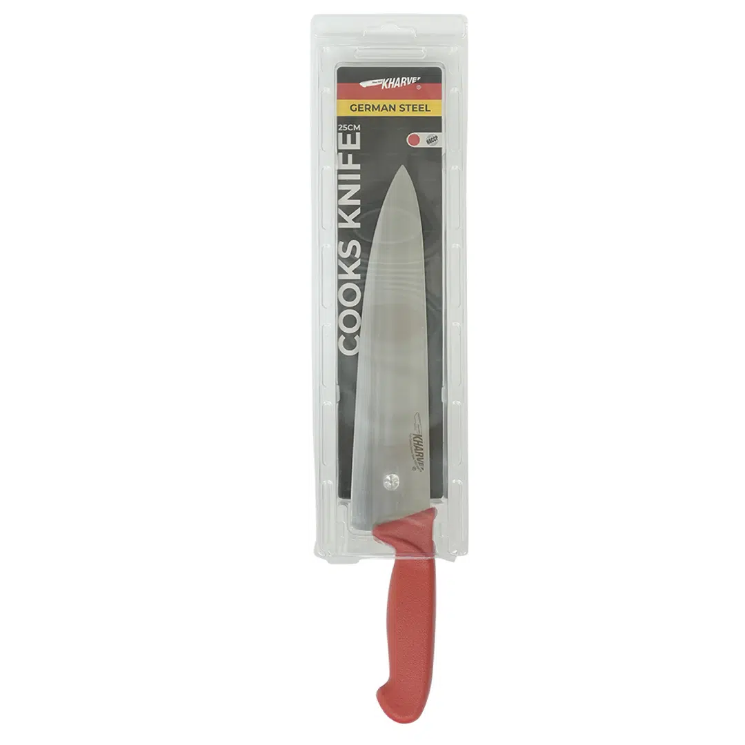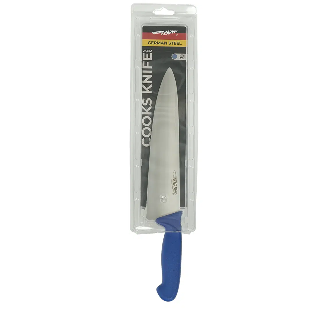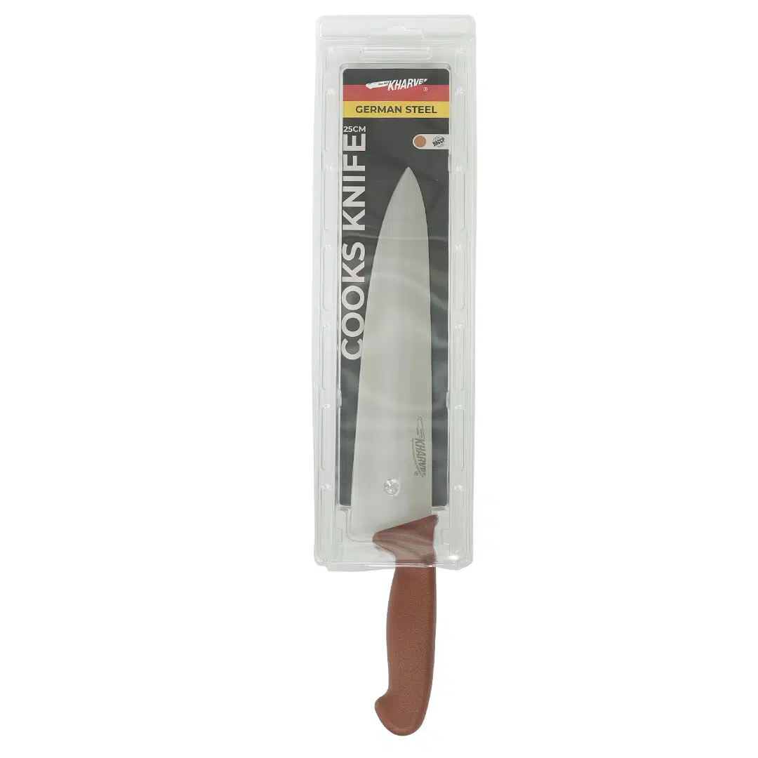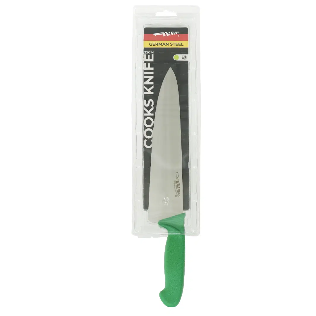 The KH Kharve® Cooks Knife 25cm effortlessly handles chopping, carving, slicing, dicing, and cutting various foods, allowing every member of your kitchen staff to prepare popular dishes with ease.